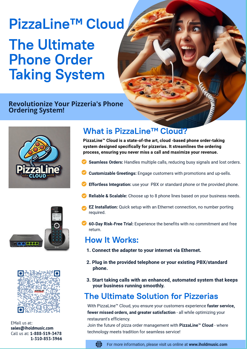 Our clients range from independent pizzerias to national chains in USA /Canada and other countries, With iHoldMusic you get piece of mind that you have a knowledgeable industry partner that is able to increase your profit margins. (we have served pizza industry since 1999 - over 100K of our on hold devices are installed worldwide in last 25 years most still in operation)