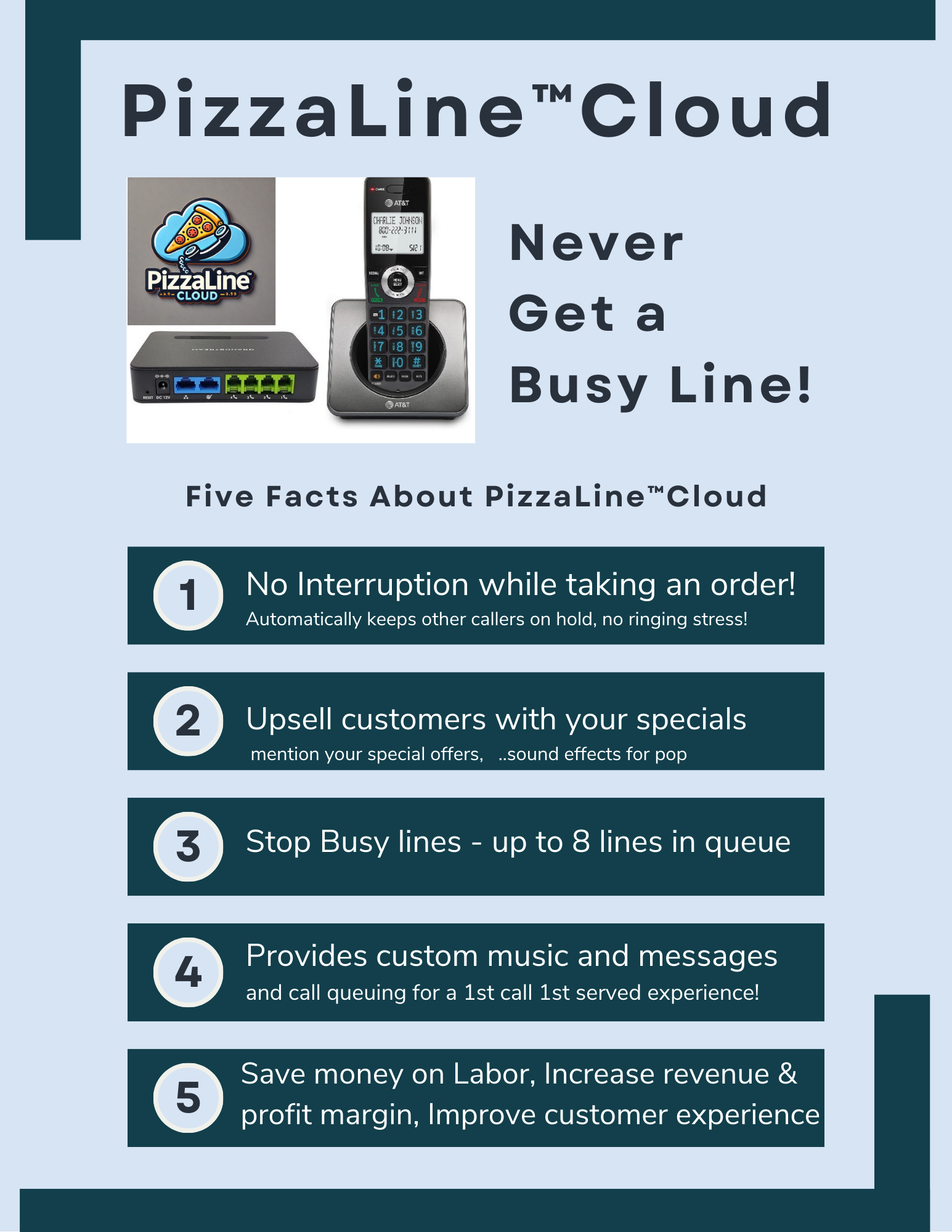 Improving your call handling efficiency can therefore directly impact your bottom line. The new PizzaLine™ Cloud is the most cost effective order taking system service that can be used to address all these scenarios. It is a cloud based system with a provided phone and small box that connects to your internet via Ethernet cable, there is no change to your phone lines, it automatically takes care of all your phone ordering needs. You need to try it to believe it!
